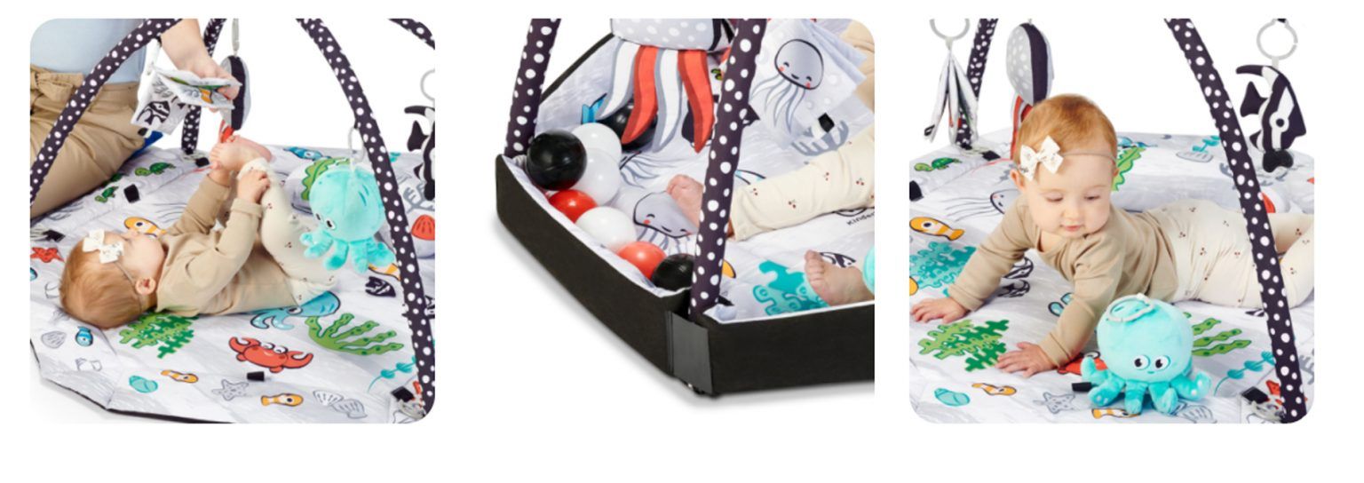 Ko bo otrok odrasel, bo lahko vadil obračanje s trebuha na hrbet. Morski slog in mirne barve na robovih SEA LAND dolgo časa pritegnejo otrokovo pozornost. Na podlago je pritrjen vzglavnik, ki olajša ležanje na trebuhu. Ko otrok odraste in začne sam sedeti, lahko površino spremenimo v bazenček z žogicami (20 pisanih kroglic v kompletu) in mehko blazino. Igrača je opremljena s 6 igračami: klopotec, grizalo, polnjena hobotnica, polnjena riba, ki jo je mogoče med stiskanjem ugrizniti, ogledala z hobotnico s šumečimi rokami in šumeča knjiga. Poleg tega je osnova SEA LAND opremljena z mehko blazino v morskem slogu, ki vašemu malčku pomaga ležati na trebuhu. Podloga ima nastavljiv lok, viseče igrače pa lahko prosto premikate in pritrjujete na izbranem mestu. Narejena je iz mehkih materialov, ki so prijetni na otip - malčku bo na njej zagotovo udobno. Poleg tega odlično izolira tla.