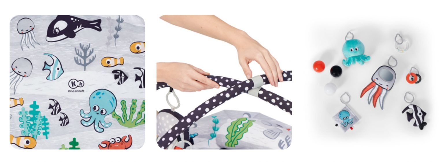 ● V kompletu je kar 6 senzorično spodbudnih igrač: klopotec, grizalo, polnjena hobotnica, plišasta riba, ki jo lahko med stiskanjem ugrizne in zapiska, ogledala z hobotnico s šumečimi rokami, šumeča knjiga in 20 barvitih kroglic.